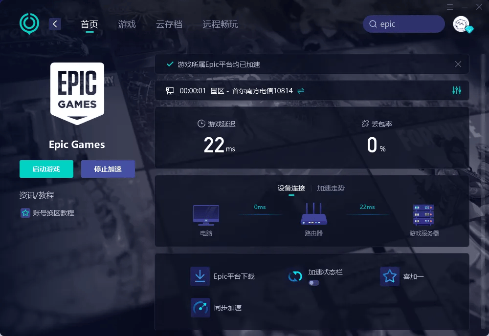活动高峰时段,领取过程常会遇到网络不稳定。建议开启UU加速器的丢包保护功能,特别适用于校园网或WiFi环境。只需在加速器内搜索并选择“Epic”加速节点,即可有效提升连接质量。